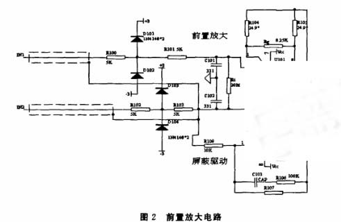 信號前置放大級的增益不易設(shè)定太高,以免在干擾較強時引起信號嚴(yán)重失真,為更好地消除共模電壓,設(shè)計了自舉屏蔽馭動電路,如圖2所示.采用緩沖放大器將連接點的共模電位馭動到屏蔽線.在輸入共模信號時使屏蔽線與芯線等電位.在差模信號輸人時沒有影響.