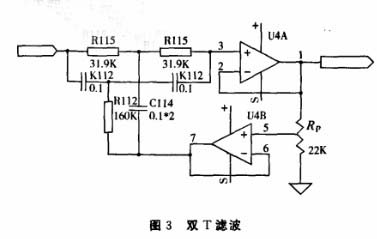 傳感器輸出信號受到各種嗓聲的干擾,嗓聲來源通常有下面幾種:工頻干擾、電極接觸噪聲、基線漂移等.其中,這些干擾中50Hz的工頻干擾最為嚴(yán)重,也是最難消除的.其他的各種嗓聲通過高截低通、高通低截濾波方法可以很好地消除.本文主要討論50H的工頻干擾的濾除.本系統(tǒng)充分發(fā)揮單片機(jī)系統(tǒng)的強大優(yōu)勢,編制50Hz數(shù)字濾波程序,從硬件和軟件2方面對其進(jìn)行消除.硬件部分采用雙T有源濾波器.其具體電路如圖3所示.