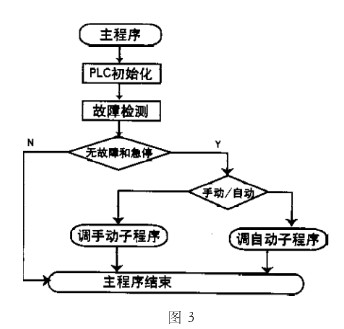 控制系統軟件設計根據系統要求,編寫了系統軟件:程序流程圖如圖3所示。程序由主程序和兩個子程序組成,主程序實現系統初始化、檢測、判斷,子程序分別實現手動和自動控制。程序中編寫了定時程序,使內部定時器按規定的時間動作。