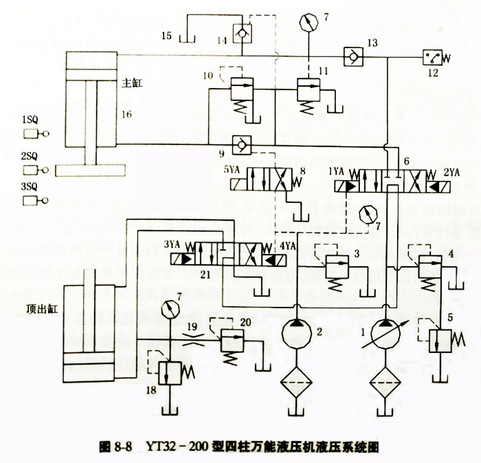 原位停止是上滑塊上升至預定高度,擋塊壓下行程開關1SQ,電磁鐵2YA失電,電液閥回到中位,這時主缸停止運動,液壓泵卸荷。