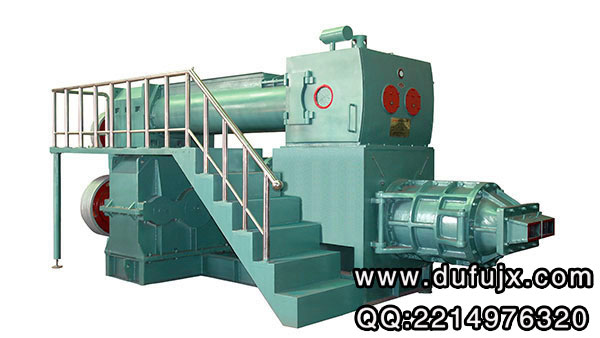 雙級真空擠出機擠出部分的工作原理是:上級絞刀把原料供入真空室進入下級受料箱,經壓泥板反復下壓進入下級螺旋絞刀,再由下級螺旋絞刀連續向前推送、擠壓,使原料在封閉的泥缸內形成一體,由機頭、機口擠出成型。